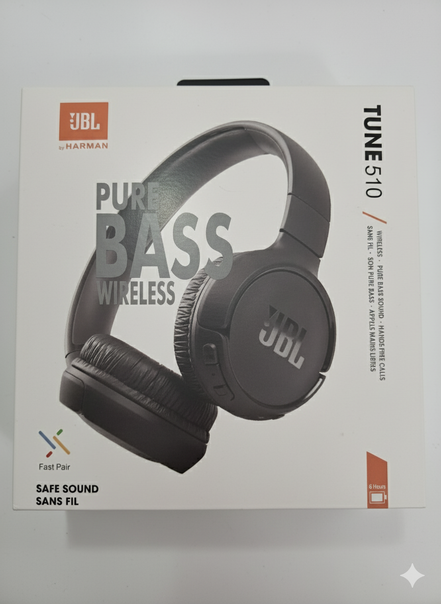 JBL Tune 510 — som Pure Bass, emparelhamento rápido (Fast Pair) e Safe Sound. Leve, confortável e pronto para o dia a dia.